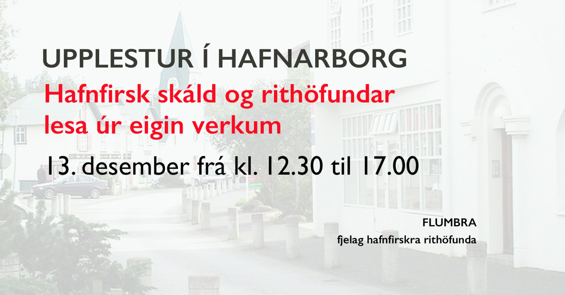 Flumbra, félag hafnfirskra rithöfunda, heldur upplestur í Hafnarborg laugardaginn 13. desember. Þar verður lesinn fjölbreytilegur skáldskapur fyrir fólk á öllum aldri; jafnt kátlegar sögur sem falleg ljóð.
